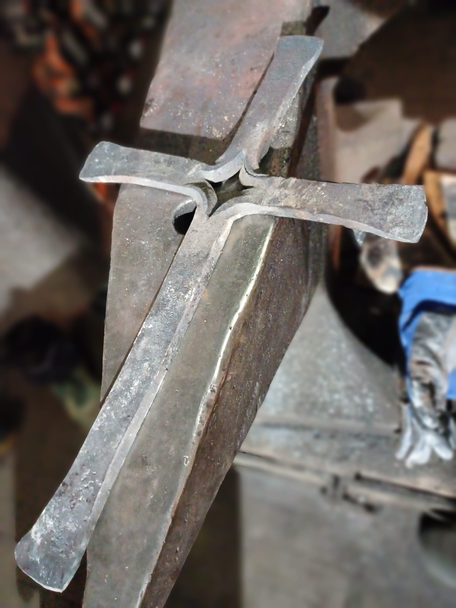 Das Kreuz ist aus einem einzigen Stab Stahl von Hand geschmiedet. Die Einschnitte werden von jedem Ende bis kurz über die Mitte des Stabes gesetzt, die dann geöffnet werden, indem der glühende Stab über den Amboss geschlagen wird. Das "Auffalten" erinnert an Origami und eröffnet ein diamantförmiges Auge. Anschließend wird das Schmiedestück auf dem Amboss gehämmert.